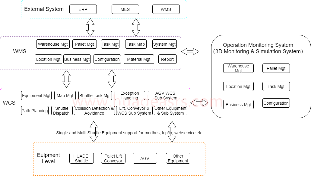 HUAYIDE tin rằng trong giải pháp ASRS, "phần mềm định nghĩa phần cứng", và phần mềm quyết định sự trôi chảy và phối hợp của phần cứng. Do đó, hệ thống vận chuyển pallet bốn chiều được xây dựng dựa trên WMS & WCS của chúng tôi, giúp quản lý linh hoạt các mặt hàng được lưu trữ trong kho để đảm bảo hàng tồn kho thực tế khớp với số liệu kế toán. Cùng với việc truyền dữ liệu theo thời gian thực với ERP, WMS đánh giá các đơn hàng, hàng tồn kho, nhân công và hệ thống xử lý vật liệu để thực hiện đơn hàng một cách hiệu quả. Từ khâu lưu trữ đến khâu lấy hàng và xuyên suốt quá trình vận chuyển, WMS xác định luồng và phân bổ nguồn lực hiệu quả nhất. Chúng tôi cũng cung cấp khả năng hiển thị chính xác theo khu vực về năng lực hạ nguồn, khả năng tiếp cận điểm đến và trạng thái của từng thiết bị để tận dụng tối đa không gian lưu trữ trong kho của bạn.