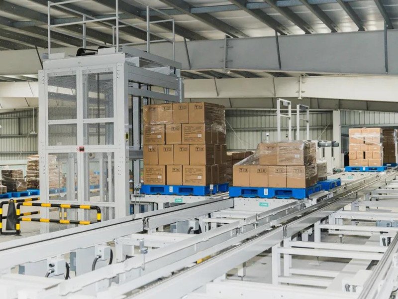 Kết nối với ram để nâng pallet từ tầng trệt lên độ cao băng tải
